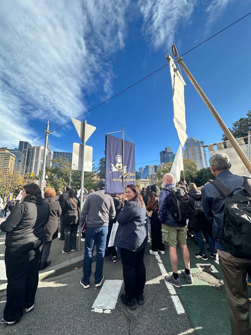 In Melbourne, the day began with a beautiful Mass at St Patrick’s Cathedral, where thousands gathered under the arching ceilings and stained glass in awe and reverence. From parishes across the Archdiocese, pilgrims streamed in—among them, many of our mothers, wearing their movement shirts with love, clutching rosaries, holding banners, and walking hand in hand with their children.