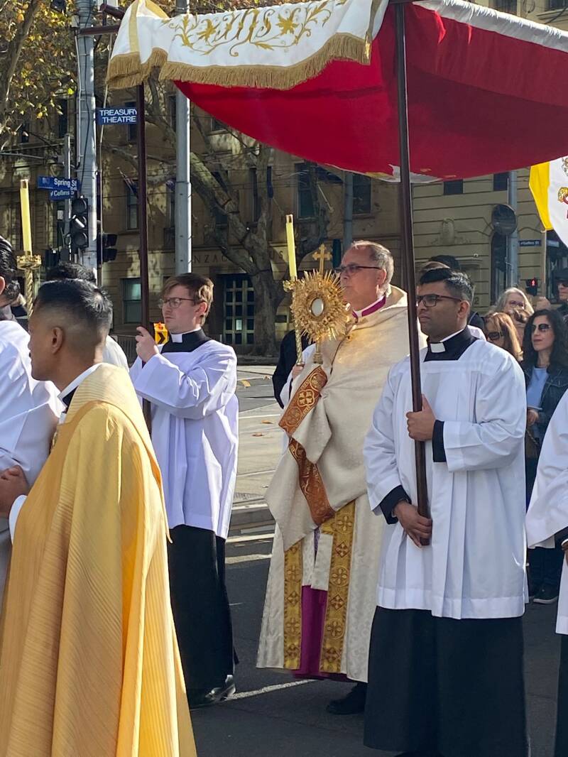 Following the Eucharistic celebration, the newly appointed Archbishop of Hobart, Bishop Antony Ireland, started the Eucharistic procession from the steps of St Patrick's Cathedral. The faithful then followed on through the city streets in a powerful public procession, where Monsignor Stuart Hall took over holding the monstrance through the Melbourne CBD. Clouds of incense rose heavenward as our Lord passed through Flinders Street, accompanied by sacred hymns and reverent silence. It was not just a walk—it was a pilgrimage of hearts.